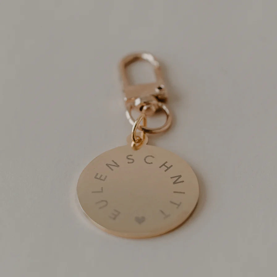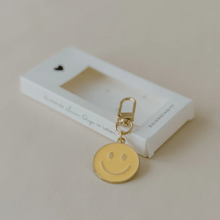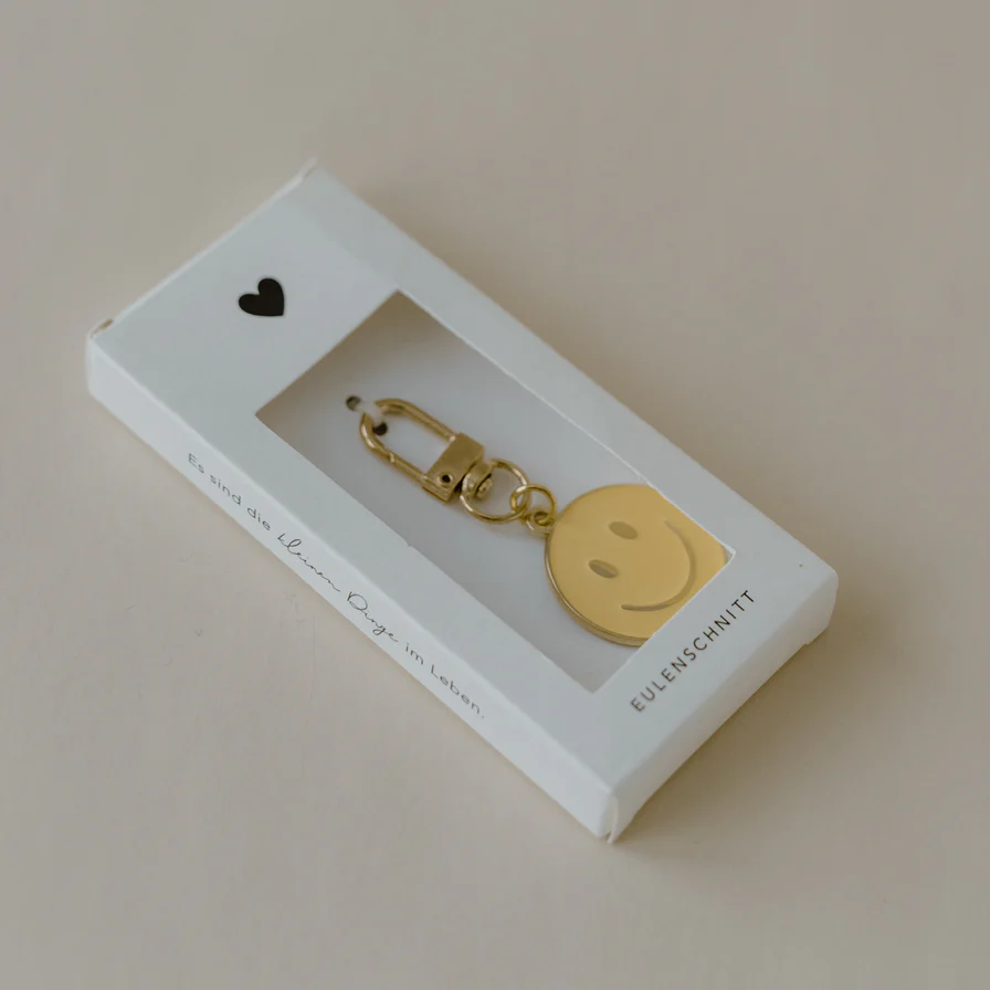 Zaubert Dir jeden Tag ein Lächeln ins Gesicht, wenn du deine Tür aufschließt, den Briefkasten öffnest oder dein Fahrrad abstellst. Unser Smiley Schlüsselanhänger ist in goldenem Design mit einem warmen Gelbton designt. Auf der Rückseite befindet sich unser Eulenschnitt Logo. Unsere Schlüsselanhänger sind super leicht und handlich.
