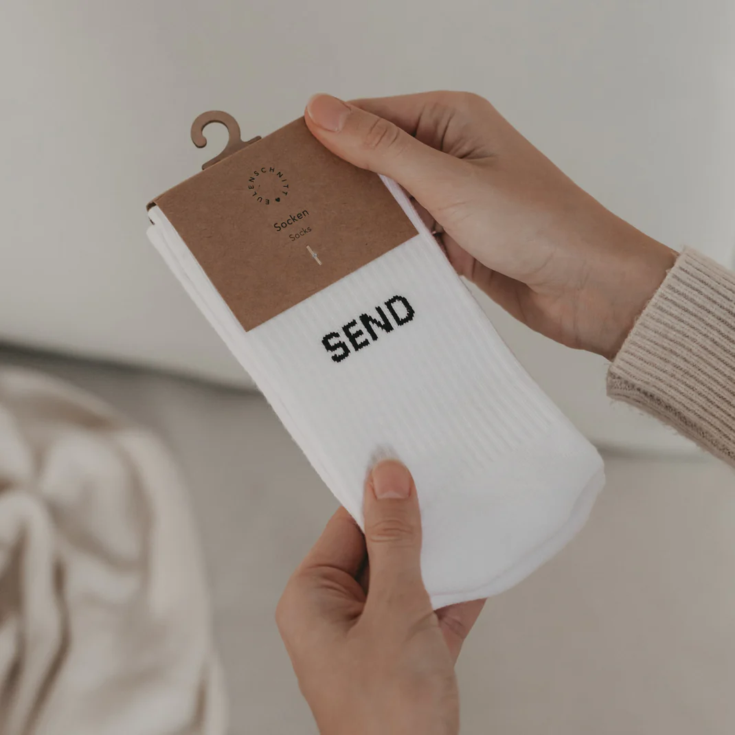 Zeig deinen Humor und setze ein gewagtes Statement mit diesen weißen Socken, die an der Ferse den frechen Schriftzug Send Nudes tragen. Diese Socken sind nicht nur ein Blickfang, sondern bieten dank der weichen Baumwolle auch den ganzen Tag über maximalen Komfort.