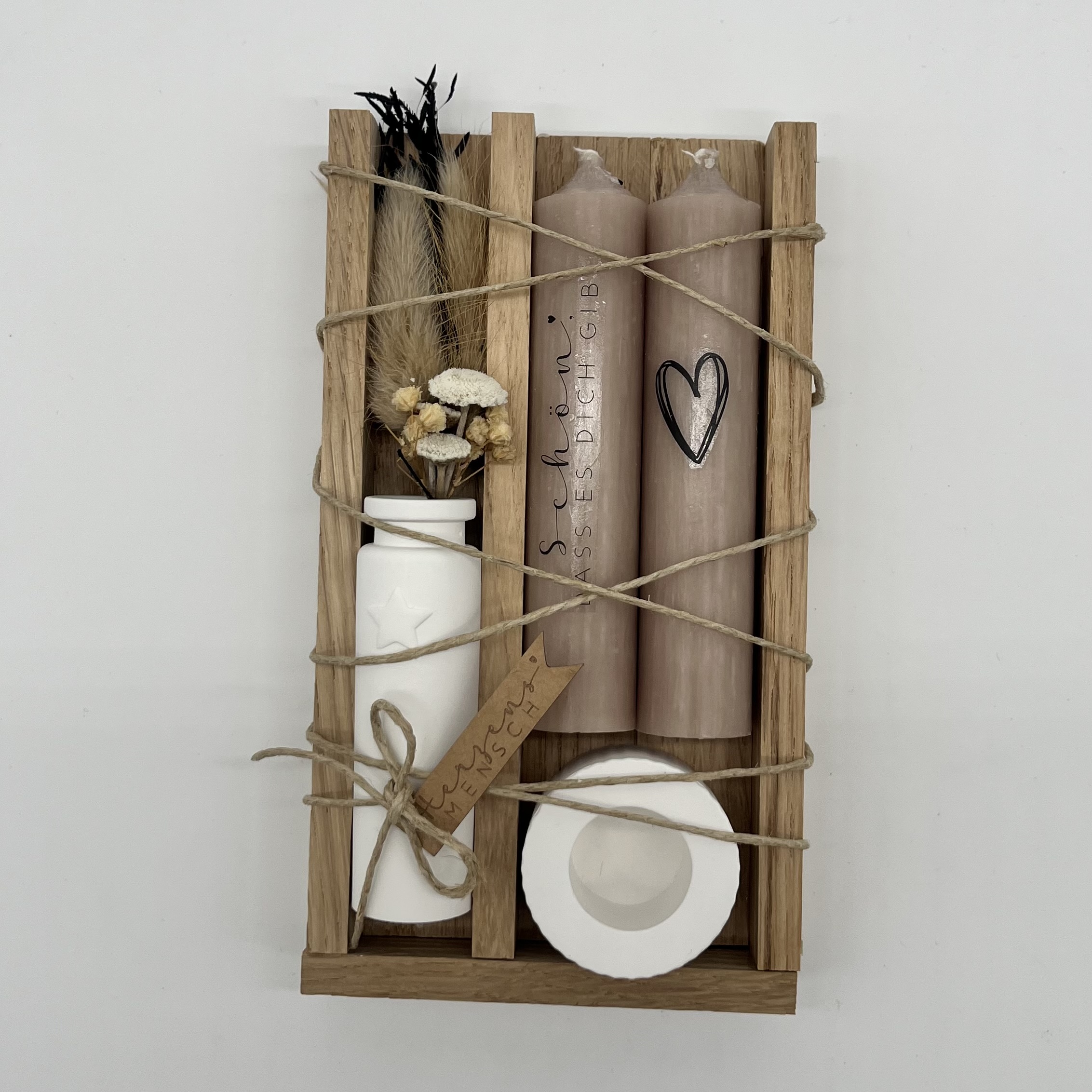 Das Set bestehend aus 2 Kerzen, einem Kerzenständer und einer kleine Vase mit Trockenblumen Sträußchen kommt liebevoll verpackt in einer Holzbox und kann so gleich verschenkt werden.