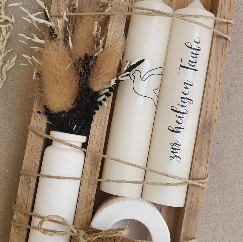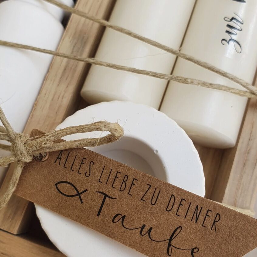 Bestehend aus 2 Kerzen und 1 Kerzenhalter verpackt in einer Holzbox umwickelt mit Jutegarn und einem Kraftpapier Schild.