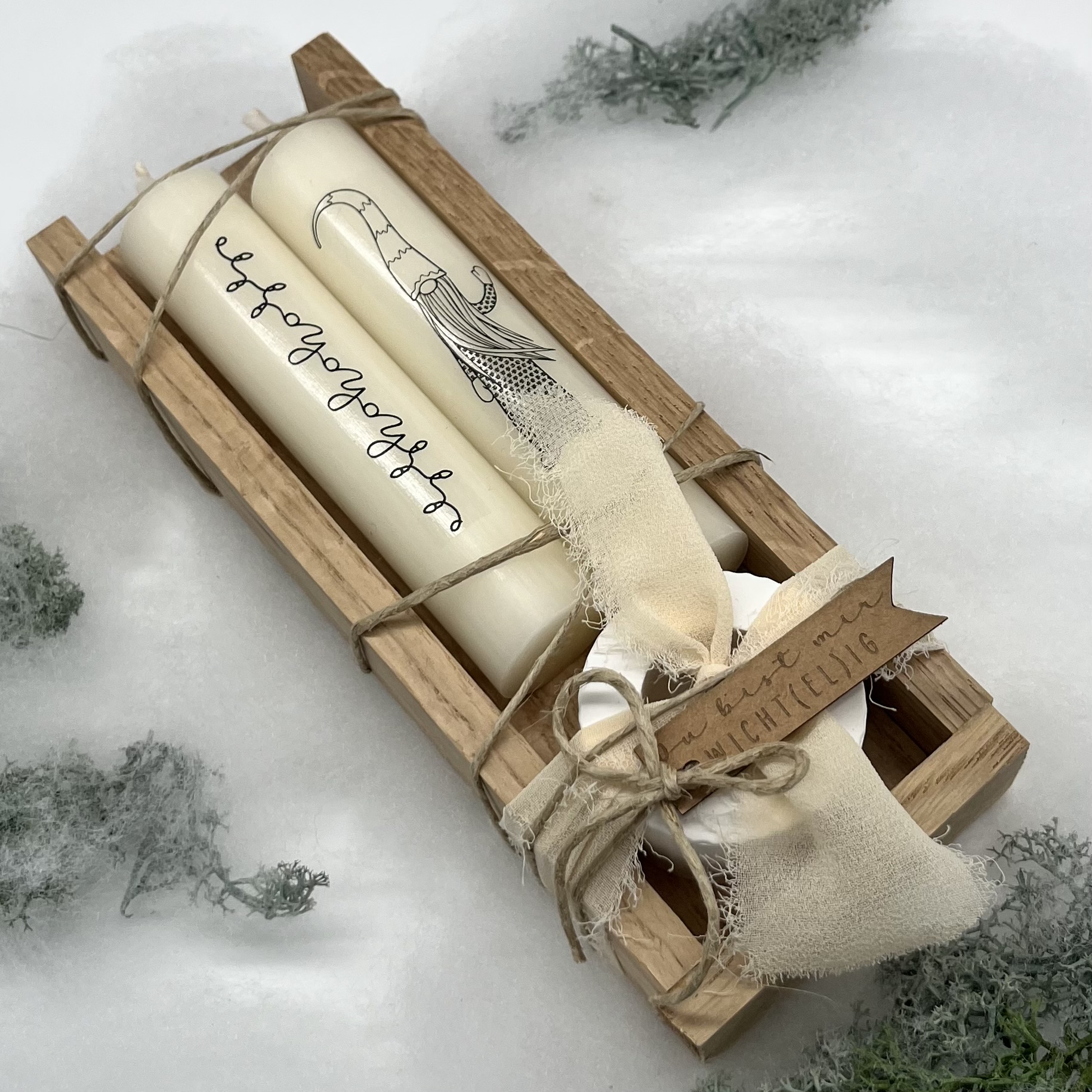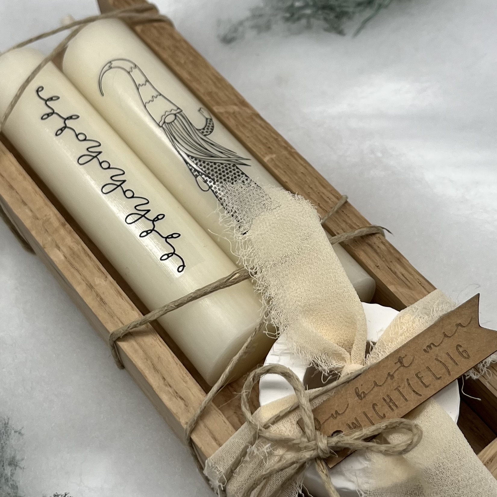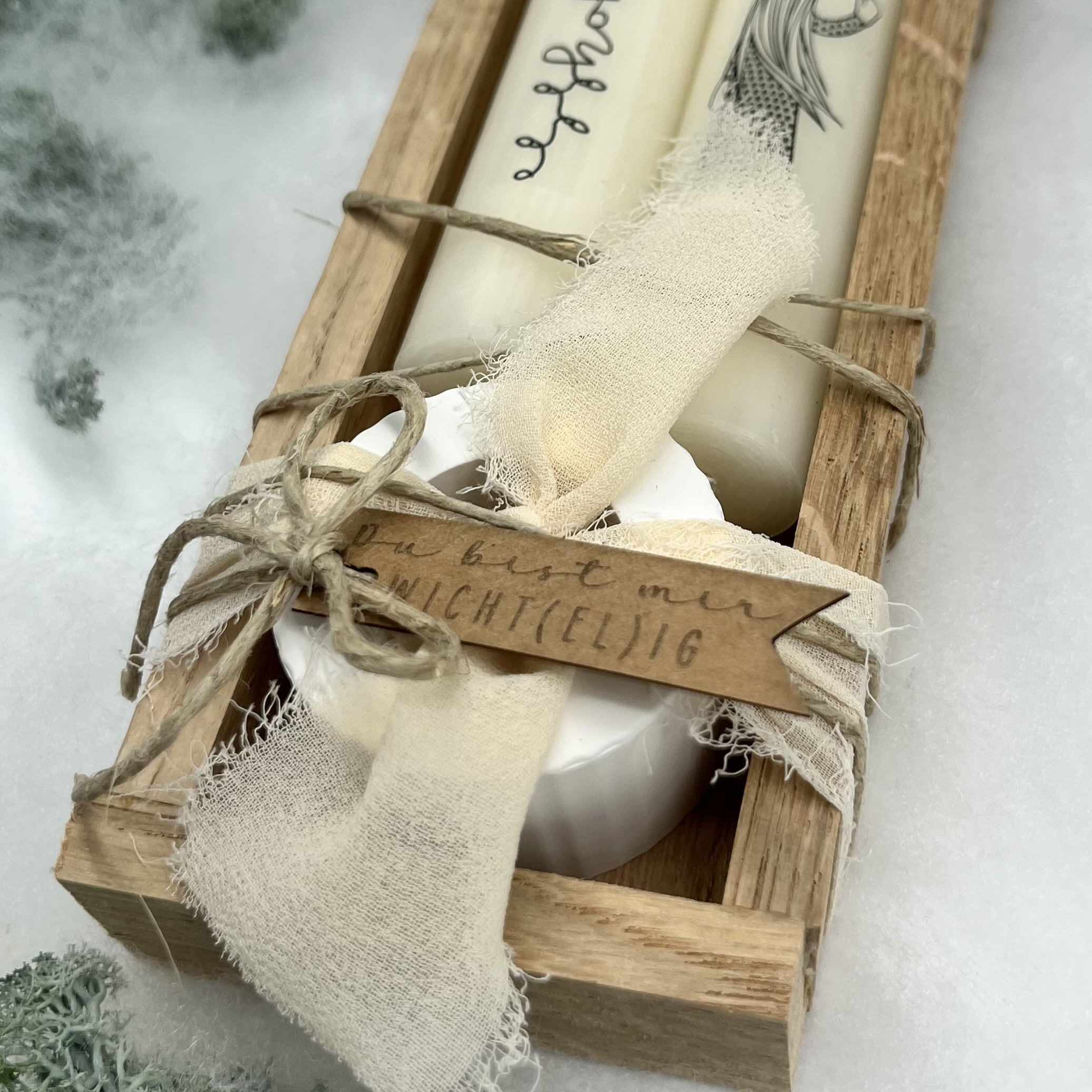 Bestehend aus 2 Kerzen und 1 Kerzenhalter verpackt in einer Holzbox umwickelt mit Jutegarn, Geschenkband und einem Kraftpapier Schild.