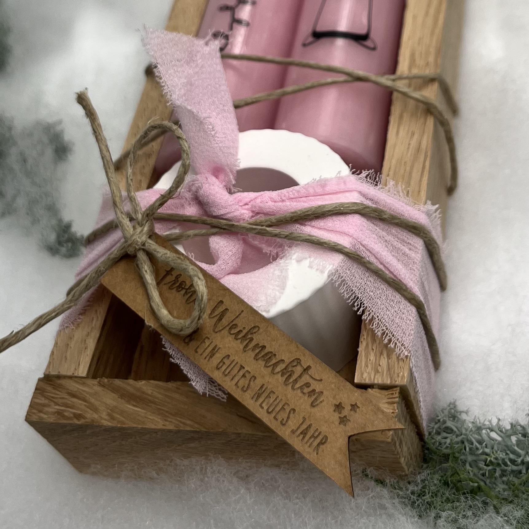 Bestehend aus 2 Kerzen und 1 Kerzenhalter verpackt in einer Holzbox umwickelt mit Jutegarn, Geschenkband und einem Kraftpapier Schild.