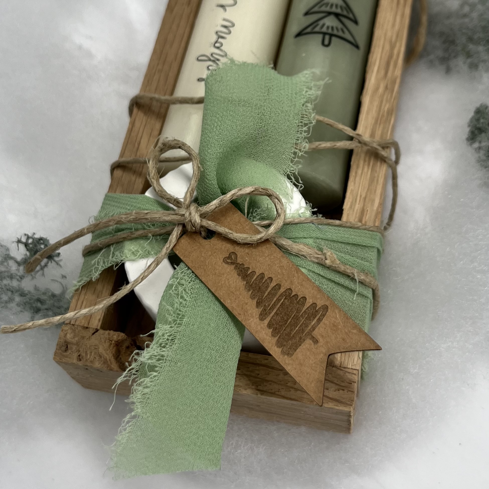 Bestehend aus 2 Kerzen und 1 Kerzenhalter verpackt in einer Holzbox umwickelt mit Jutegarn, Geschenkband und einem Kraftpapier Schild.