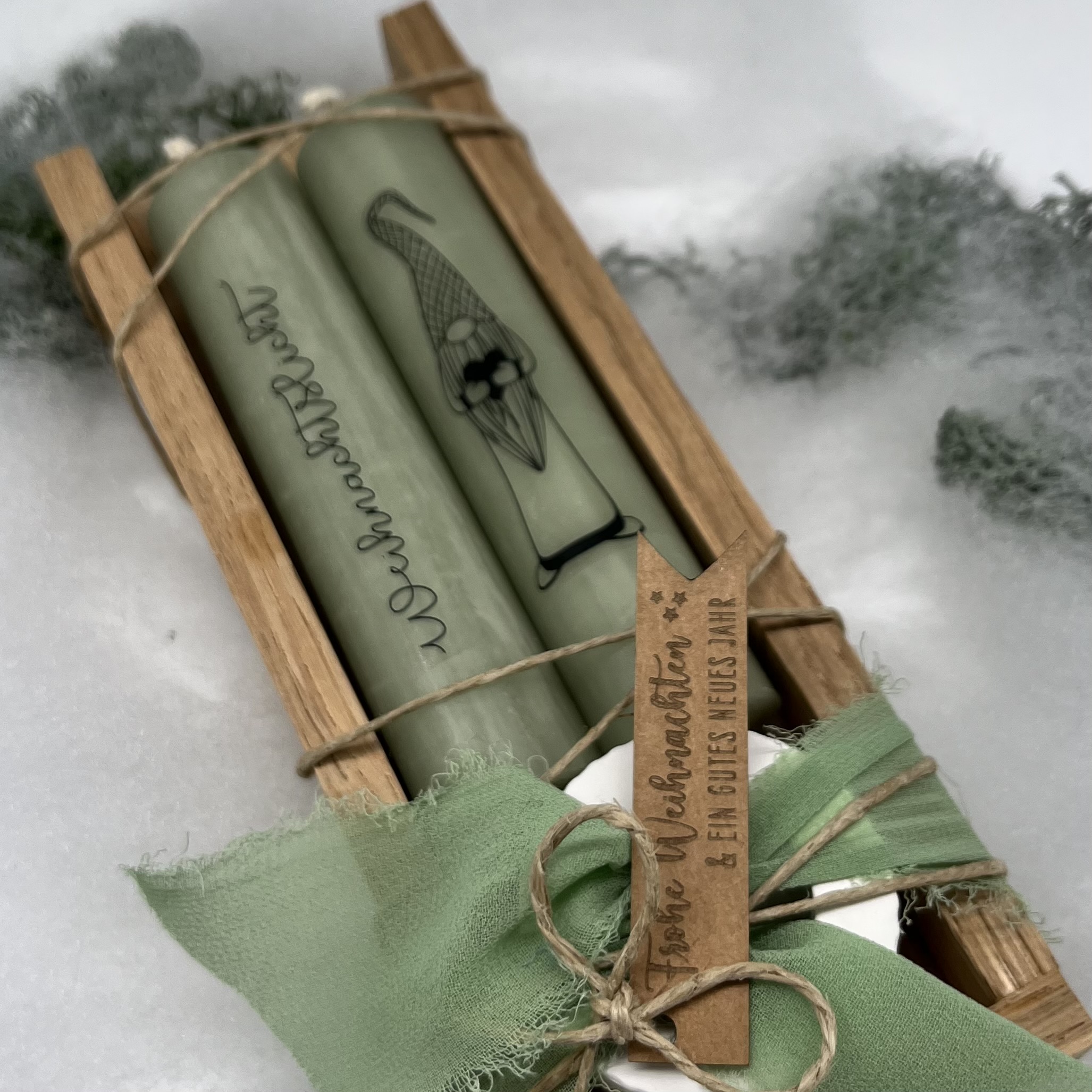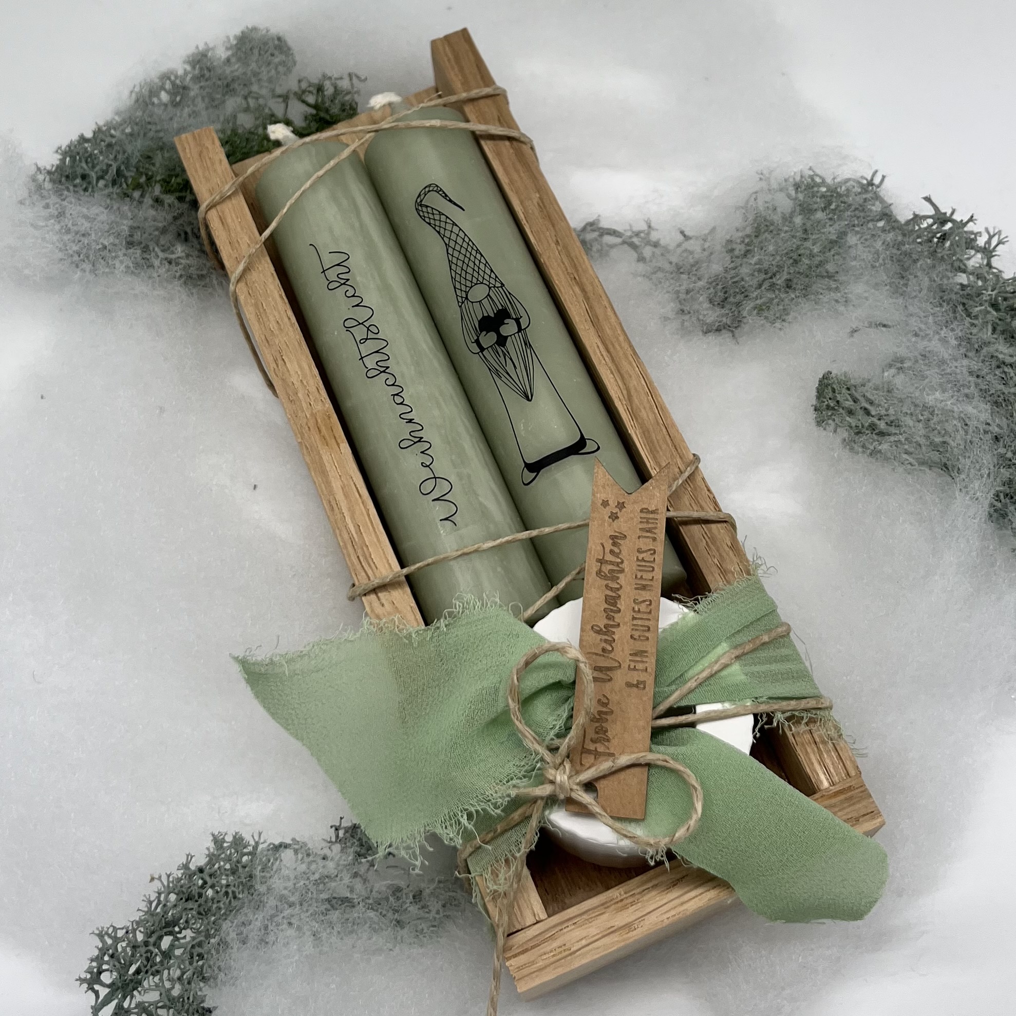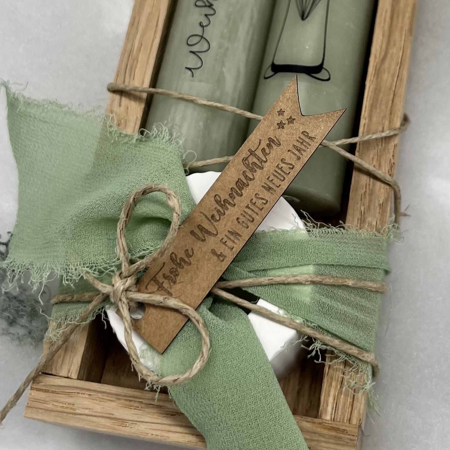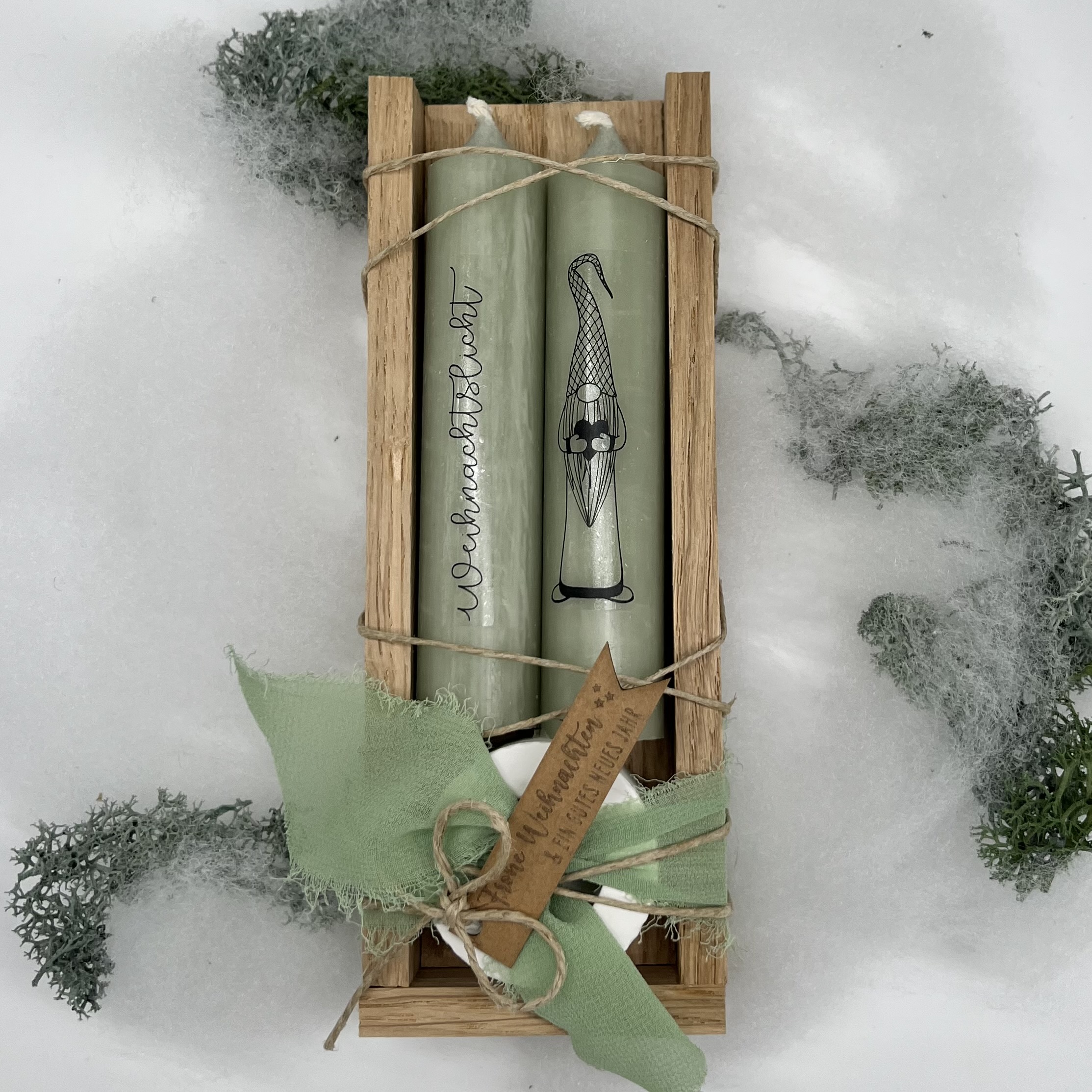 Bestehend aus 2 Kerzen und 1 Kerzenhalter verpackt in einer Holzbox umwickelt mit Jutegarn, Geschenkband und einem Kraftpapier Schild.