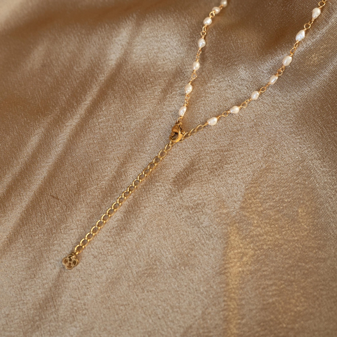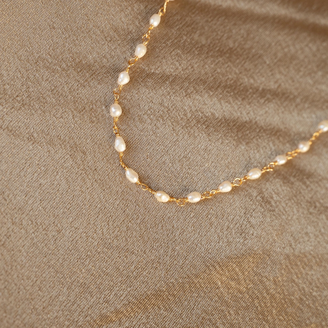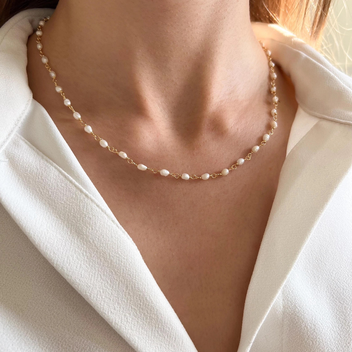 Halskette bestehend aus einer Edelstahlkette und kleinen Süßwasserperlen. Sie wird nah am Hals getragen, die Länge ist dank der kleinen 3 cm langen Verstellkette anpassbar.