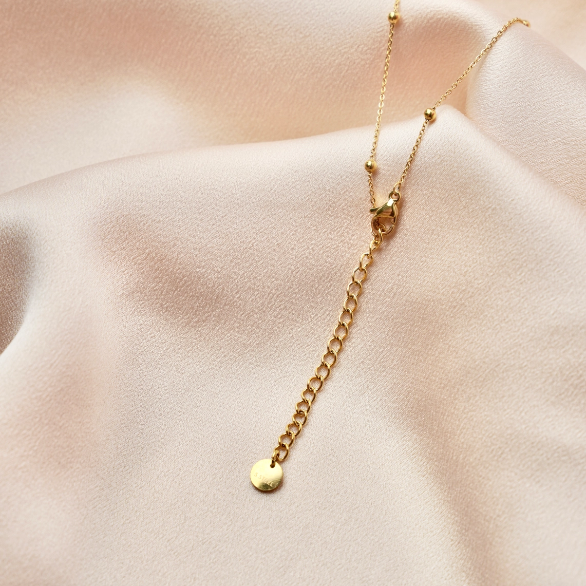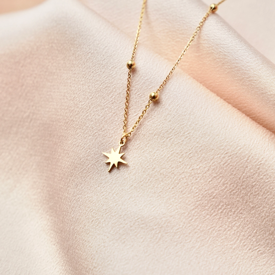 Damenhalskette aus Edelstahl mit einer dünnen Kugelkette mit kleinem Sternanhänger. Es schließt mit einem Karabinerverschluss und die Länge ist dank der kleinen 5 cm langen Verstellkette verstellbar. Minimalistisch und schick, ist es perfekt zum Verschenken!