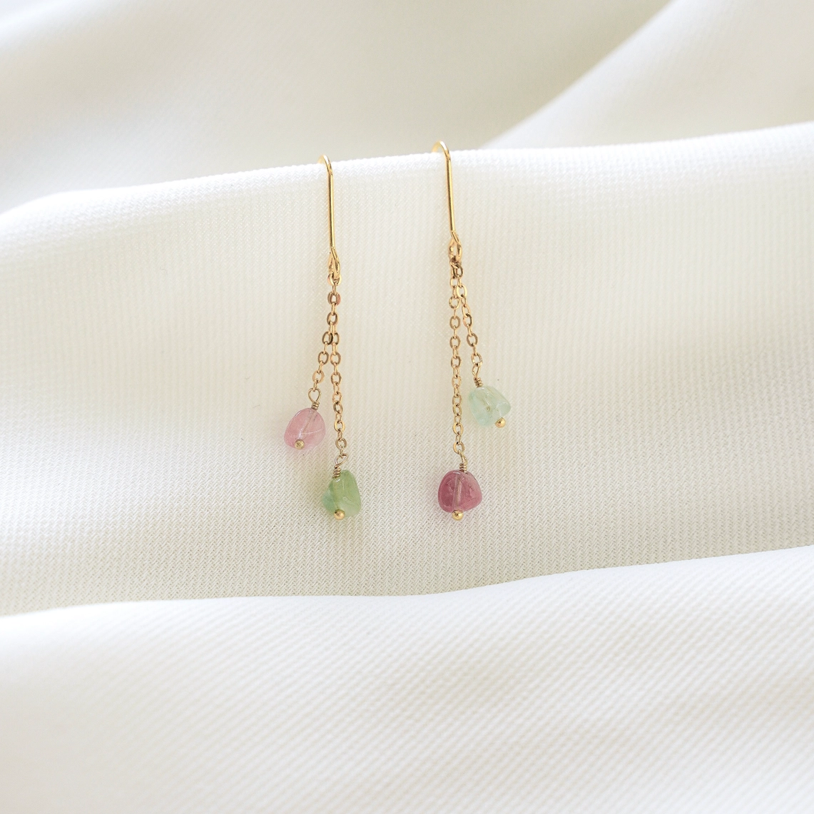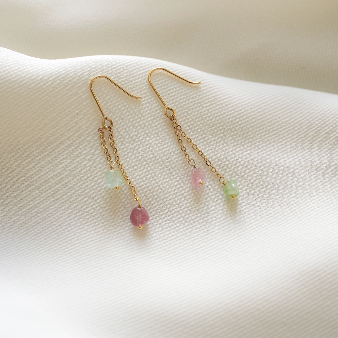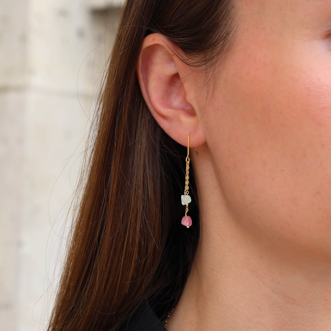 Diese hängenden Ohrringe aus Edelstahl verfügen über zwei Ketten, die mit Perlen aus Naturstein, der Turmalin, besetzt sind. Modern und minimalistisch, können sie sowohl tagsüber als auch nachts getragen werden! Der Preis gilt pro Paar.