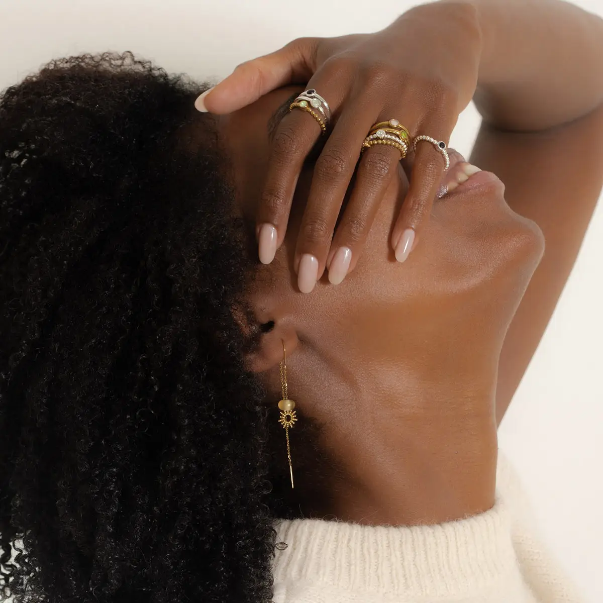 Feiere Ausgeglichenheit und Freude mit diesem doppelten Goldring mit zartrosa und grünen Steinen – eine Harmonie aus Liebe, Wachstum und lebendiger Energie. Tragen ihn einzeln oder zusammen mit anderen Ringen, als Erinnerung an besondere Momente oder als alltäglichen Zauber.