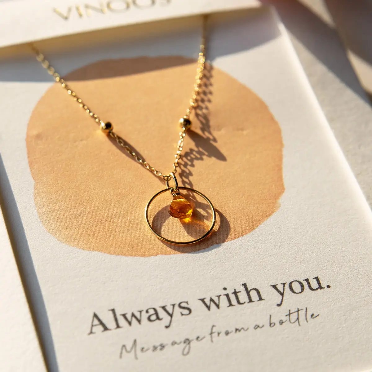 Trage mit dieser eleganten bernsteinfarbenen Kreiskette eine bedeutungsvolle Botschaft nah an deinem Herzen. Die Kreisform symbolisiert unendliche Verbundenheit und passt perfekt zum Gedanken „Always with you” – eine Liebe, die immer nah ist. Die warme Bernsteinfarbe verleiht dem Schmuckstück einen sanften, zeitlosen Look und macht es für jeden Anlass geeignet.